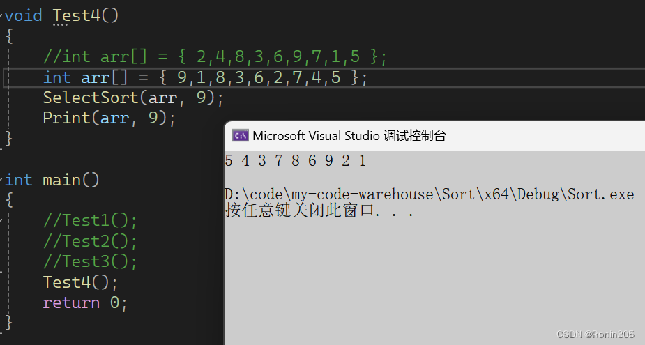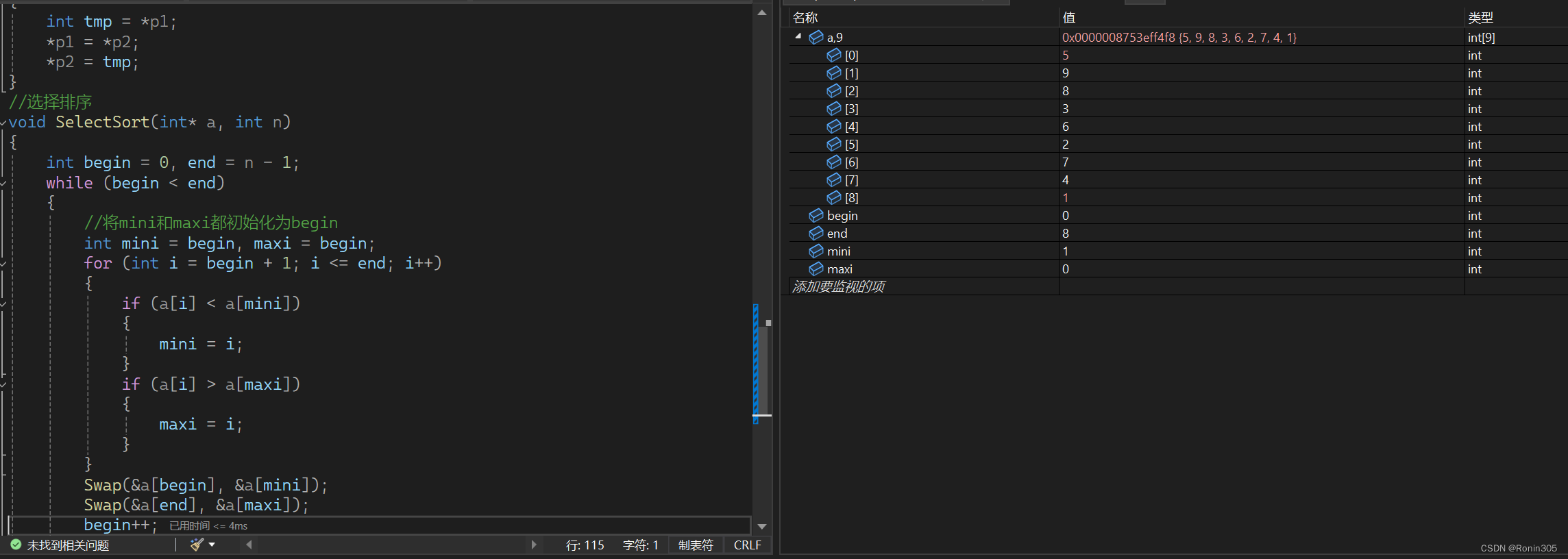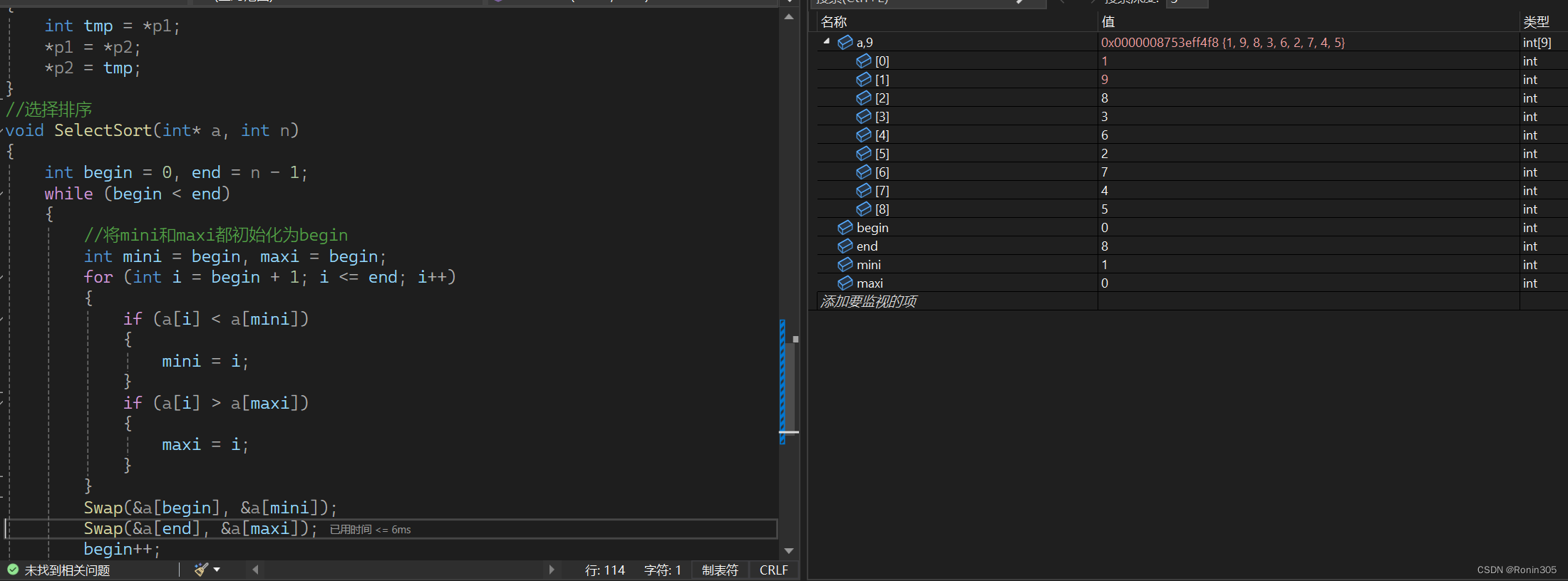 在上面两张图中,从第一张图上我们可以发现最小的1与最大的9交换完之后,我们的maxi还是0,然后在第二张图上可以看到,由于maxi还是0,就变成了0下标的1和end下标的5交换。所以从这里我们就能看出问题,maxi在这种情况时需要刷新成交换后的下标。