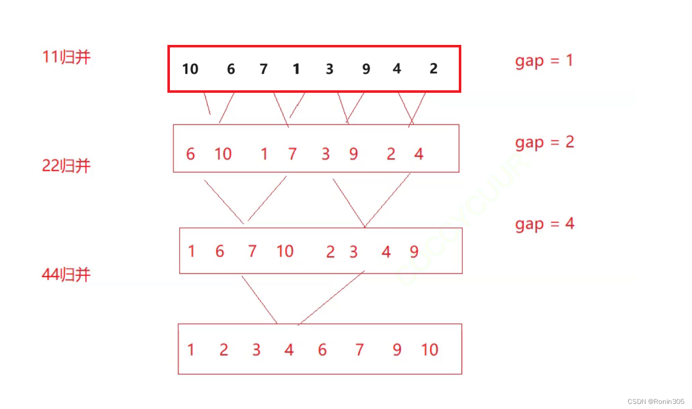 这里我们直接循环进行归并,gap=1时,就一个数和一个数进行归并,gap=2,就两个数和两个数进行归并,如下图所示: