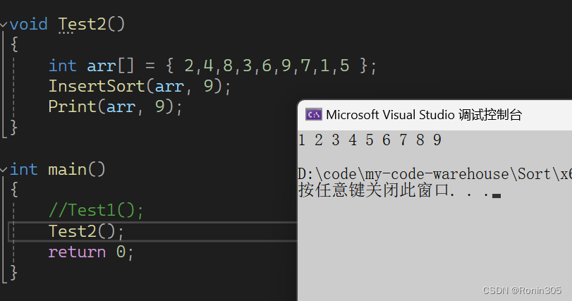 然后我们再来看一下完整的,数组的最后一个数的下标是n-1,最后要让end+1位置的值,也即是下标为n-1的数,往[0,end]中插入,所以end最后为n-2,也就是循环结束的条件是i<n-1。
