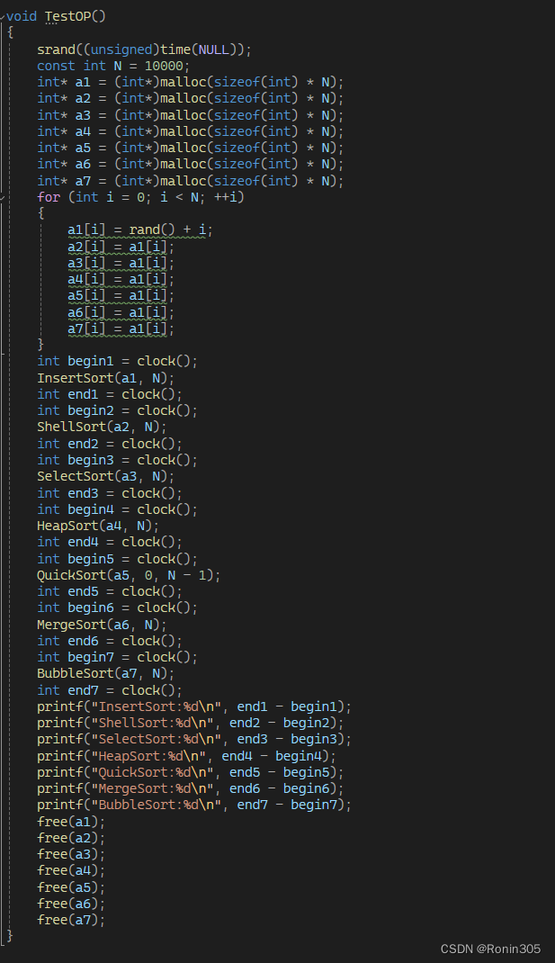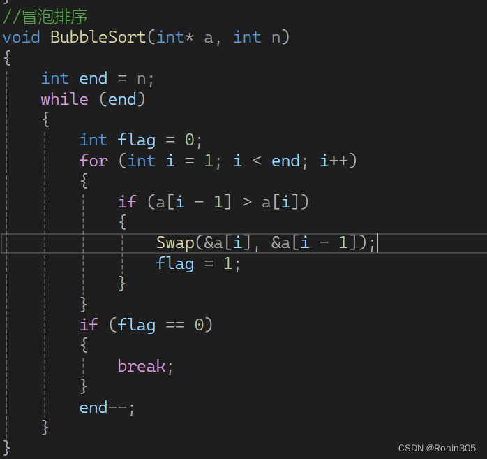 冒泡排序还是非常简单的,对于新手来说具有教学意义,但实践中不会用到,在这里我们对其优化了一下,如果是顺序的话,我们定义了一个变量flag=0,在顺序时不会进入for循环的if语句中,flag就还是等于0,进入第二个if语句中,直接跳出循环,所以在顺序时只需要遍历一遍数组,时间复杂度这时为O(N),提高了效率。