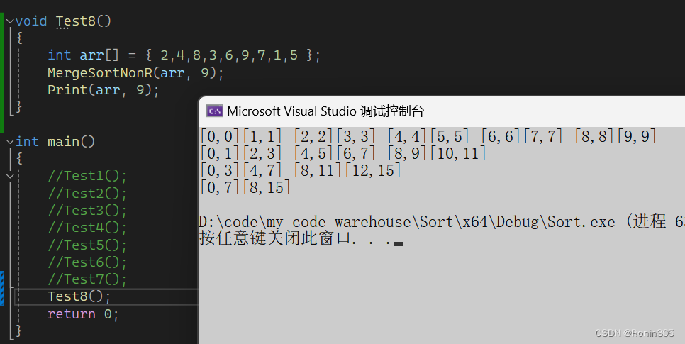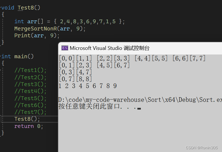 注意:不能在[begin,mid-1][mid,end]有序后开始归并,为什么呢?因为会出现死循环,导致栈溢出。