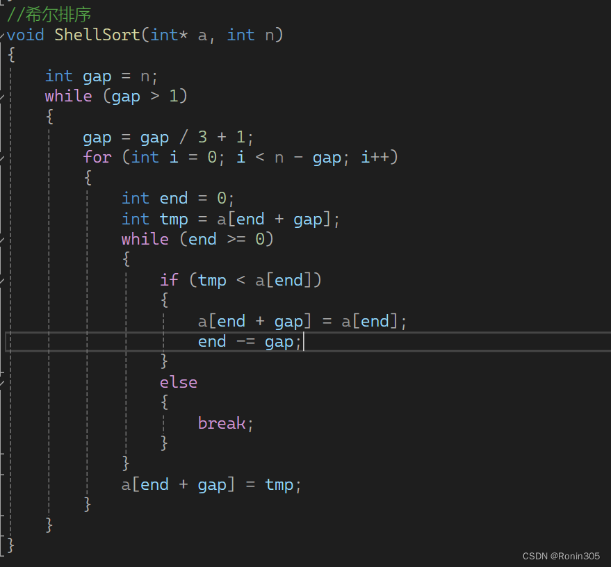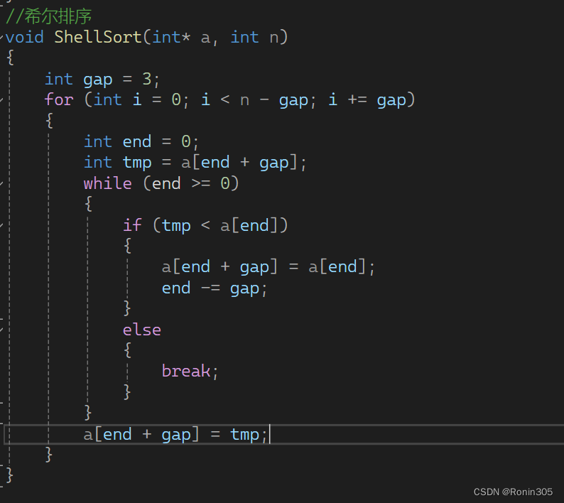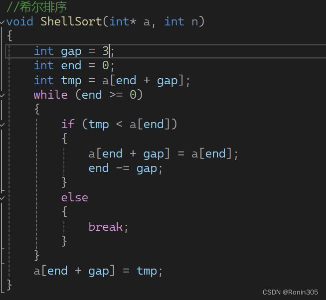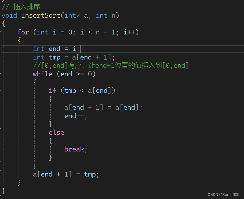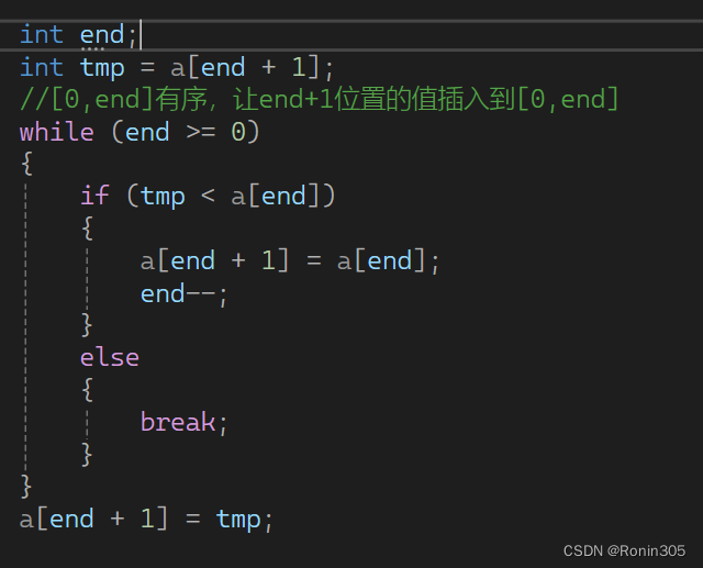 我们每次要拿有序后的那个值插入到有序的部分里,让他们变成有序,所以我们定义一个end,让[0,end]有序,让end+1位置的值插入到[0,end]中,这里在循环结束后我们再让tmp插入,而不是在else语句中,因为我们要考虑到一种情况,就是end+1位置的值最小,要将它插入到最左边,我们始终都没有进入else语句中,直到循环结束,所以在循环结束后插入才是方便的,不然还要再判断一下。