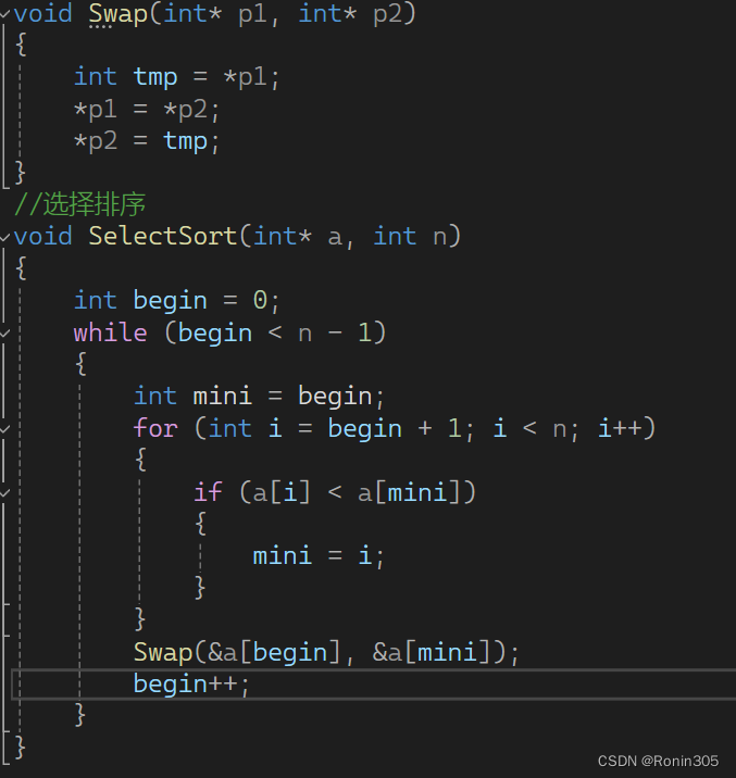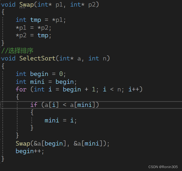 我们先来实现单趟排序,我们定义一个变量begin和一个变量mini(其中mini是最小数字的下标,begin是依次排序时的下标)先遍历一遍找到最小的,将其下标赋值给mini,循环结束后,将下标为begin和mini的两个数字交换,然后begin++接下来找第二小的,重复以上步骤。