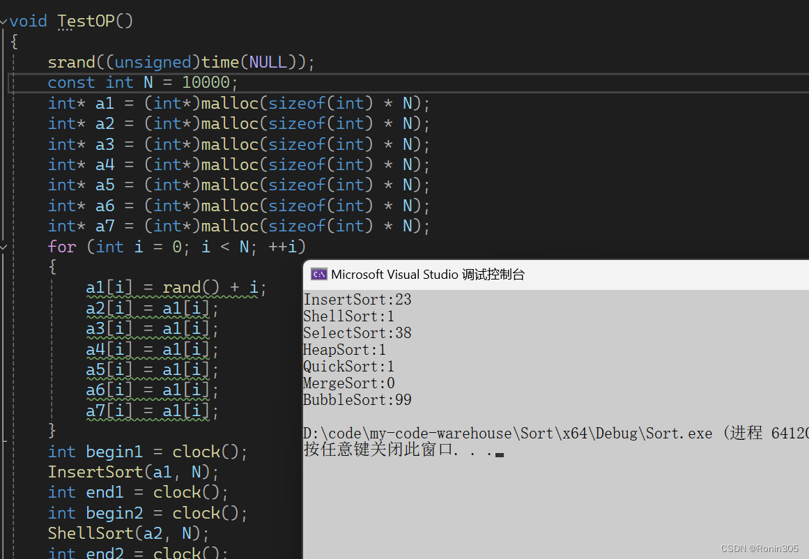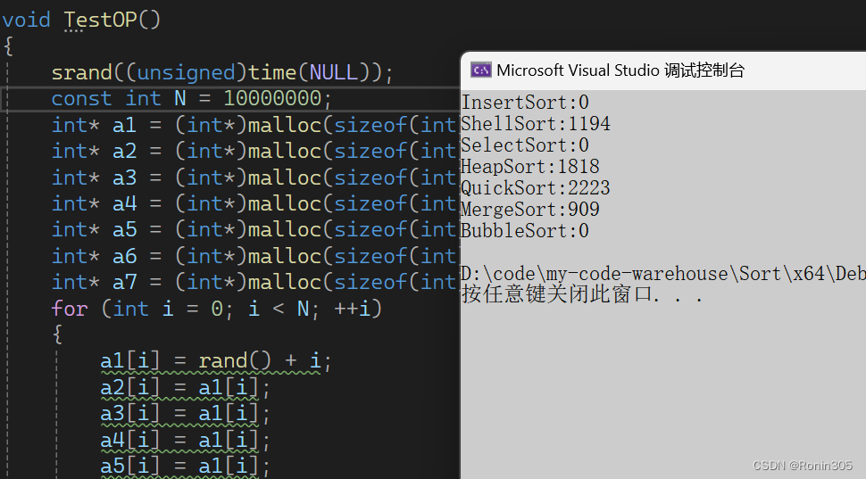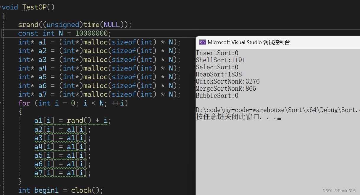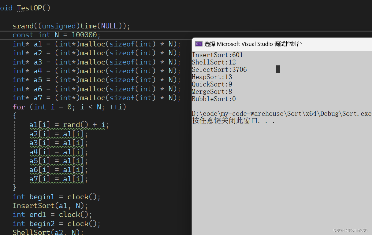 然后再来将数据个数提升至100000(由于冒泡比较慢,就直接不测试了)