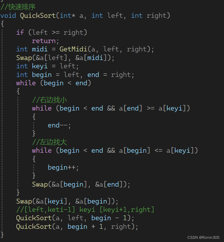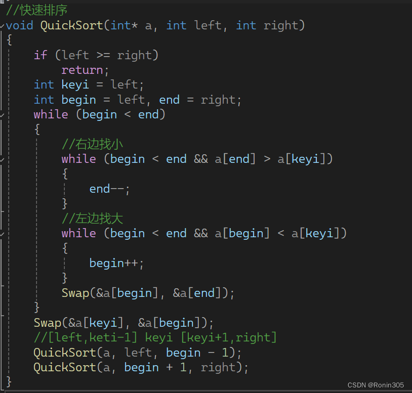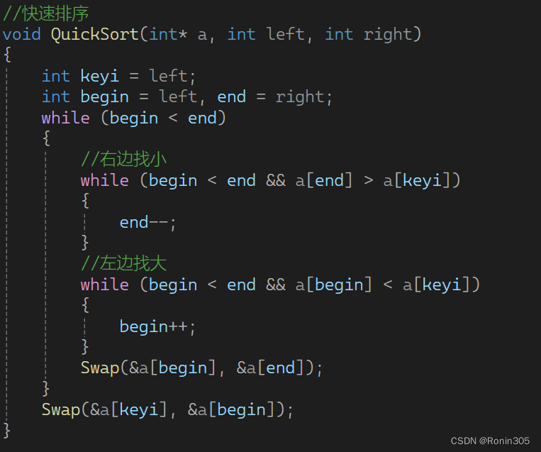 先来实现单趟排序,还是比较简单的,但是要注意一点,就是右边找小和左边找大时也要保证begin<end。另外keyi下标位置的值key交换后,左边全是比key小的,右边全是比key大的。