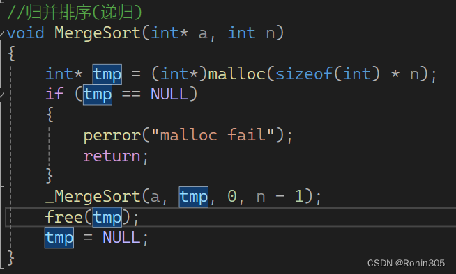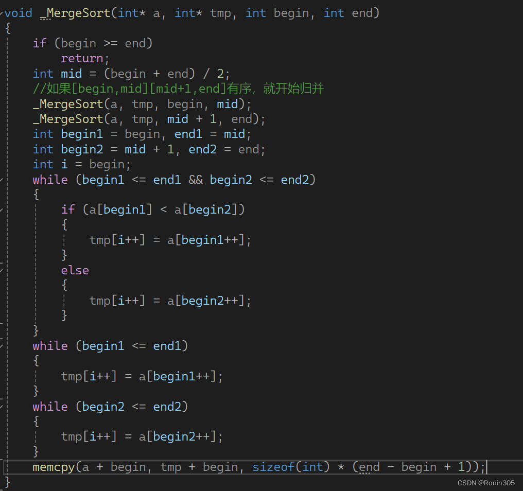 后序递归,先递归左子序列,在递归右子序列,然后再归并。最后再把归并好后的数据复制给原数组,注意a和tmp要+begin,因为归并右子序列时,要从mid+1开始复制。