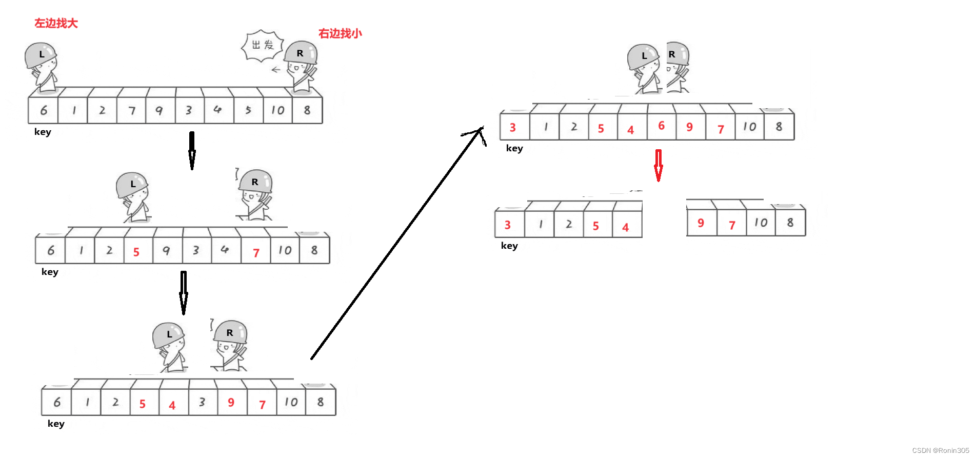 单趟排序完之后,如下图,但是并没有排序好,还需要继续排左边和右边,所以我们可以通过递归左右子序列,继续排序,这样的话递归完就能排序好整个数组