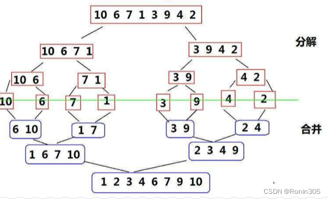 归并排序( MERGE-SORT )是建立在归并操作上的一种有效的排序算法 , 该算法是采用分治法( Divide and Conquer)的一个非常典型的应用。将已有序的子序列合并,得到完全有序的序列;即先使每个子序列有序,再使子序列段间有序。若将两个有序表合并成一个有序表,称为二路归并。 归并排序核心步骤: