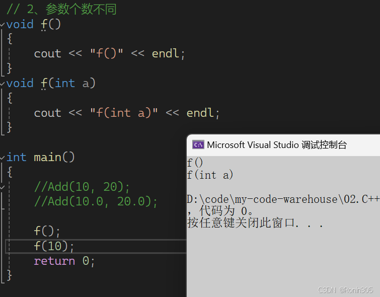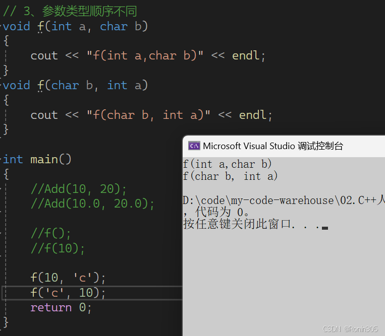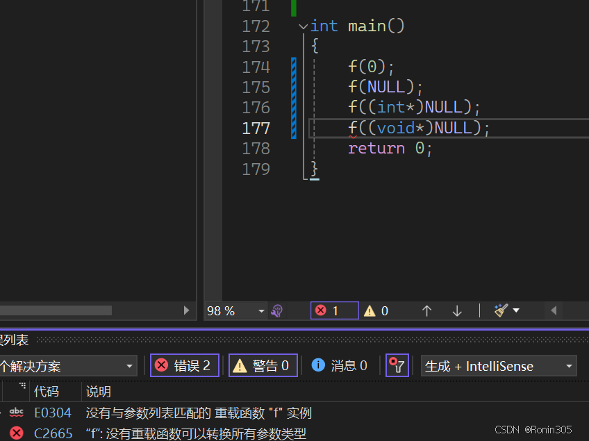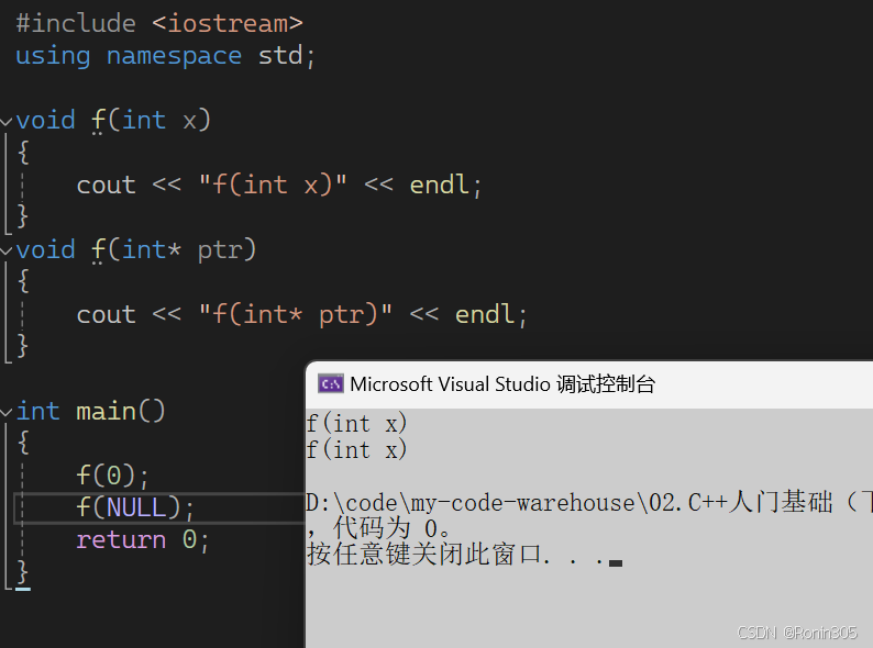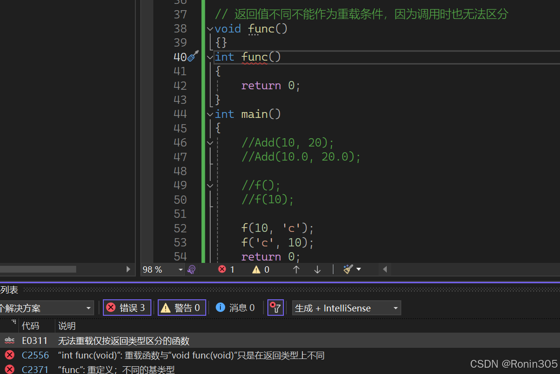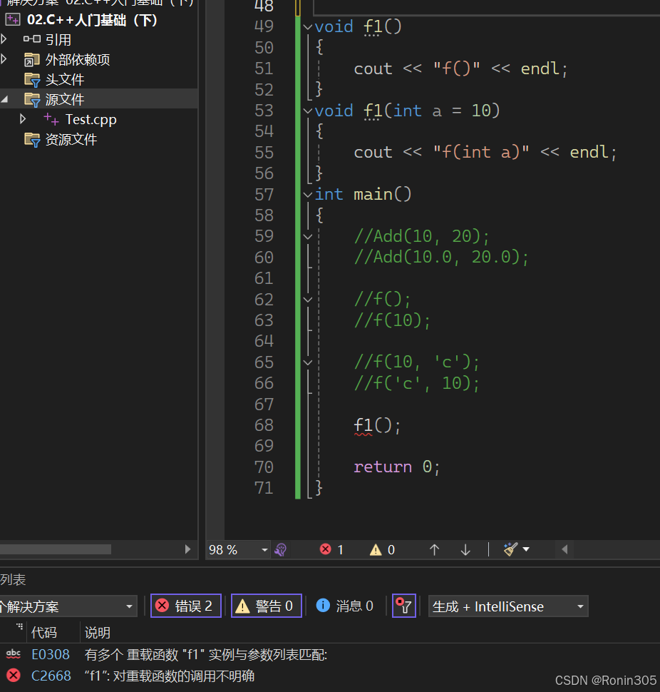这种情况也是不行的,下面两个函数构成重载,但第二个f1函数使用了缺省参数,f1()调用时会报错,存在歧义,编译器不知道调用谁。