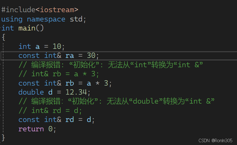 cout << STTop(st1) << endl;• 可以引用一 个const对象,但是必须用const引用。const引用也可以引用普通对象,因为对象的访问权限在引用过程中可以缩小,但是不能放大。 • 不过需要注意的是类似 int& rb = a*3; double d = 12.34; int& rd = d; 这样一些场景下a*3的结果保存在一个临时对象中, int& rd = d 也是类似,在类型转换中会产生临时对象存储中间值,也就是,rb和rd引用的都是临时对象,而C++规定临时对象具有常性,所以这里就触发了权限放大,必须要用常引用才可以。 • 所谓临时对象就是编译器需要一个空间暂存表达式的求值结果时临时创建的一个未命名的对象,C++中把这个未命名对象叫做临时对象。