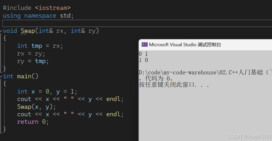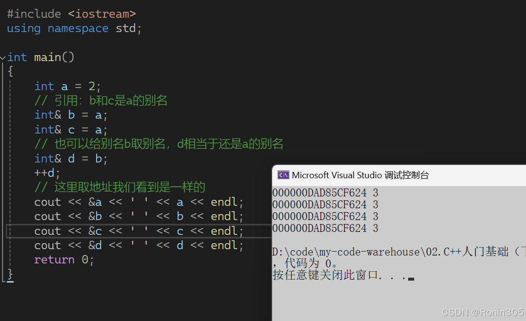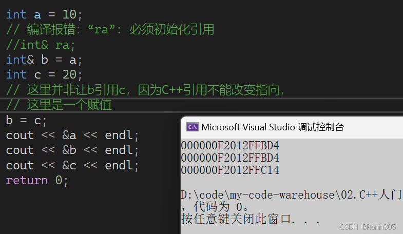引用不是新定义一个变量,而是给已存在变量取了一个别名,编译器不会为引用变量开辟内存空间,它和它引用的变量共用同一块内存空间。比如:水浒传中李逵,江湖上人称"黑旋风";林冲,外号豹子头; 类型& 引用别名 = 引用对象; C++中为了避免引入太多的运算符,会复用C语言的一些符号,比如前面的<< 和 >>,这里引用也和取地址使用了同一个符号&,大家注意使用方法角度区分就可以。