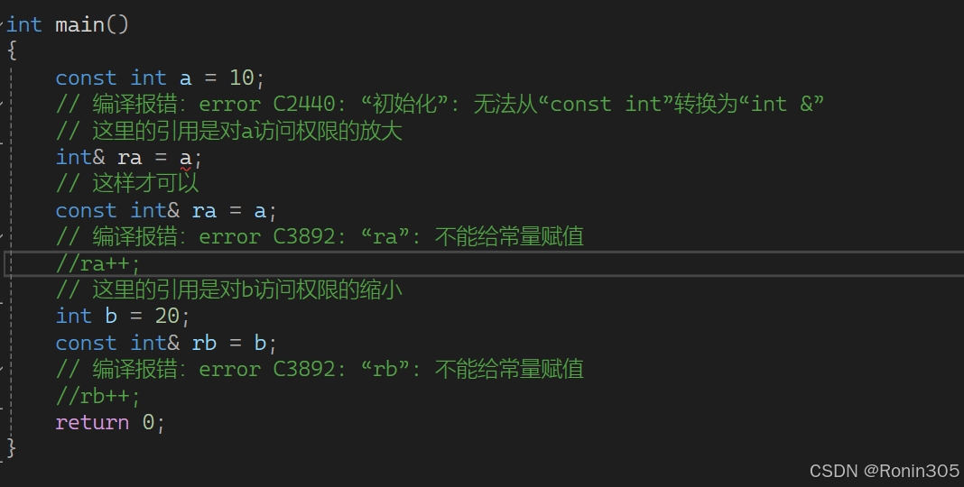 我们用const修饰变量a,那么a只能读不能写,如果我们对a引用ra,如果不加const修饰,我们就可以对ra进行读写操作,权限就放大了,这样就矛盾了,因为ra是a的引用(别名),a只能读不能写,那么ra也应该只能读不能写,所以编译就会报错。权限不能放大但是可以缩小,就像b,对b引用rb,并用const修饰,那么b可读可写,rb只能读不能写。