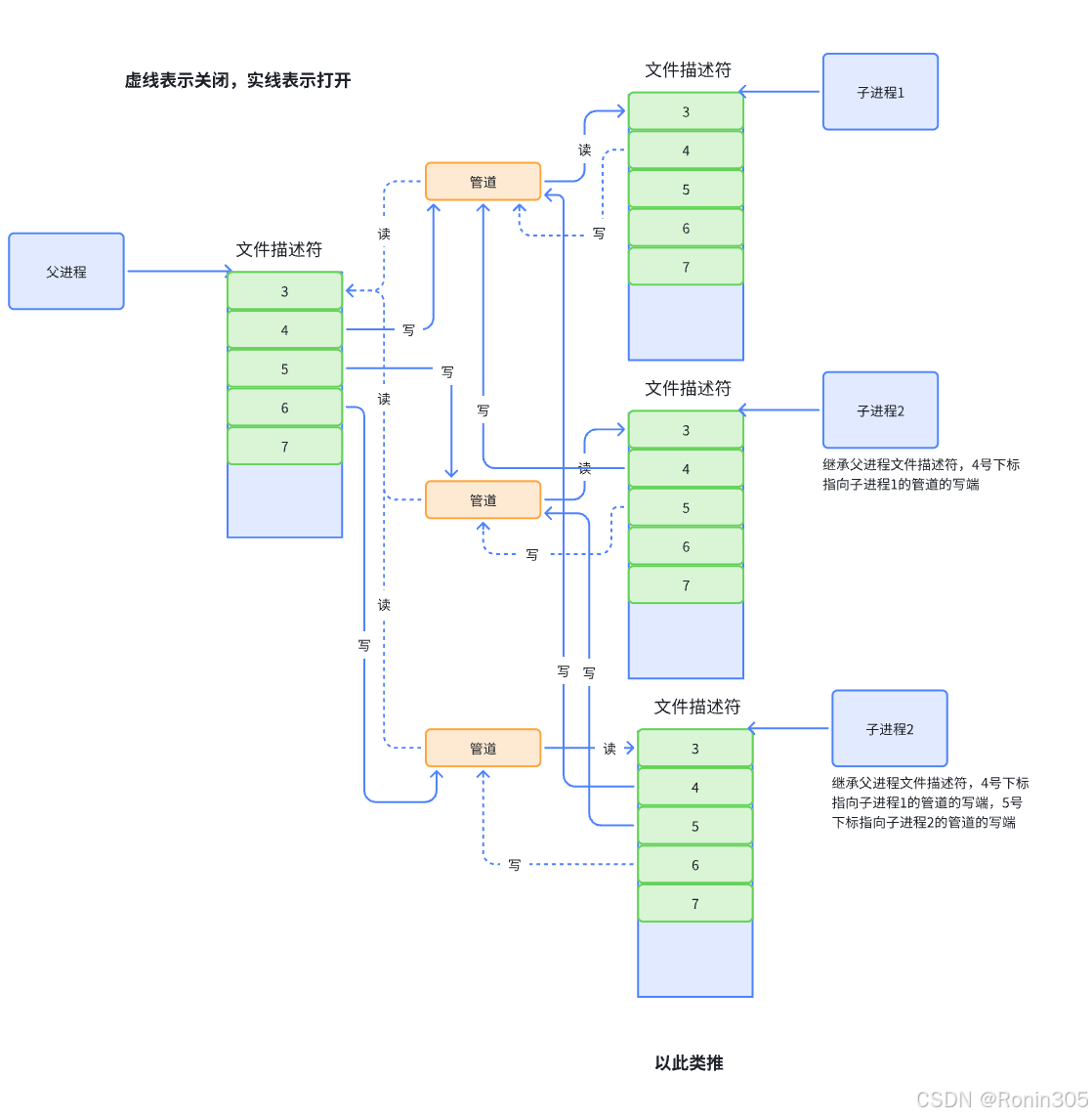 由于每次循环创建子进程时,都会拷贝父进程的文件描述符,所以原来父进程的写端指向的管道,也会被拷贝到子进程的文件描述符,所以之前的管道,也会被后创建的子进程的写端指向。