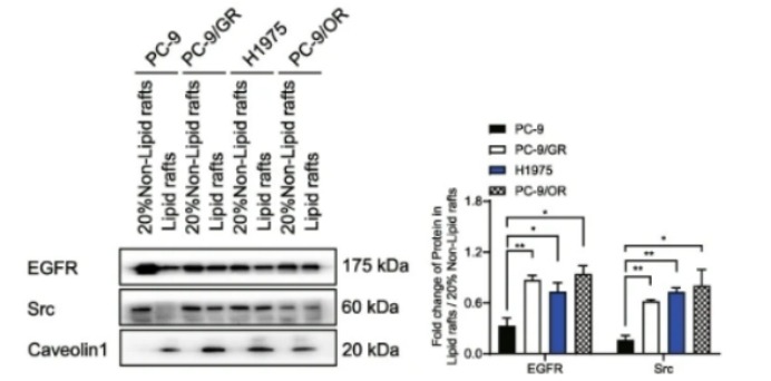 且经进一步研究发现,在EGFR-TKIs耐药过程中,胆固醇的积累会吸引EGFR和Src在脂筏中组装,并促进两种蛋白的互作,从而激活EGFR/Src/Erk信号通路和ERRα表达。