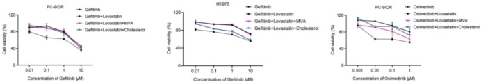 图7 用Gefitinib或Osimertinib、Gefitinib或Osimertinib+ 10 μM洛伐他汀、Gefitinib或Osimertinib+ 10 μM洛伐他汀+ 100 μM Mevalonate、Gefitinib或Osimertinib+ 10 μM洛伐他汀+ 10 μM胆固醇处理细胞48小时。