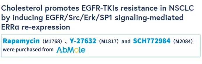 由中国药科大学基础医学与临床药学学院的ZhenZhen Pan,Kai Wang,XiNiao Wang, XuanSheng Ding以及广州医科大学附属第五医院的JianYe Zhang等多名研究人员在Mol Cancer.期刊(IF=37.3)上,发表了题为“Cholesterol promotes EGFR-TKIs resistance in NSCLC by inducing EGFR/Src/Erk/SP1 signaling-mediated ERRα re-expression”的文章。在该文章中,使用了购自AbMole的Rapamycin(M1768),Y-27632(M1817)和SCH772984(M2084)三种产品,揭示了EGFR-TKIs耐药的分子机制,并提出了克服耐药性的潜在研究方案。