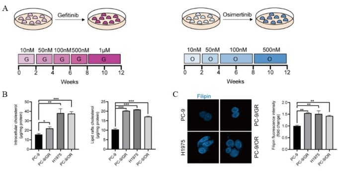 图1 A. 将PC-9细胞暴露于Gefitinib或Osimertinib12周,建立Gefitinib耐药PC-9/GR和Osimertinib耐药PC-9/OR细胞。B. 使用胆固醇检测试剂盒测定NSCLC细胞的细胞质或脂筏中的胆固醇水平。C. 细胞与0.5 mg/mL的Filipin一起孵育2小时。