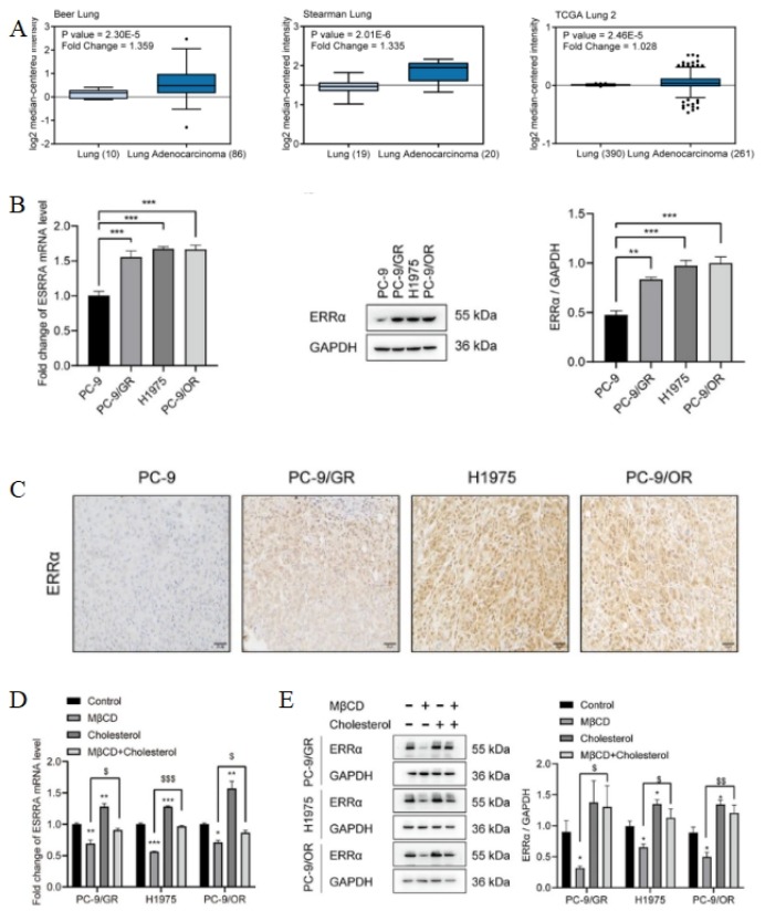 数据和P值从OncoMine数据库中获得。B. RT-qPCR和Western blot检测结果显示了ERRα的mRNA和蛋白在指定细胞中的水平。C. IHC染色检测ERRα在肿瘤中的表达。D. 用2.5 mM MβCD、10 µM胆固醇或2.5 mM MβCD +10 µM胆固醇处理细胞6h,然后通过RT-qPCR测定指示细胞中ERRα的mRNA水平。E. 用 2.5 mM MβCD, 10 µM 胆固醇或2.5 mM MβCD +10 µM 胆固醇处理细胞24h, 然后用WB检测ERRα蛋白水平。然后,通过使用XCT790下调ERRα的表达,研究人员发现能通过增加ROS水平和导致细胞周期停滞在G0/G1期,从而增加耐药细胞对EGFR抑制剂的敏感性(图3A)。同时,Gefitinib或Osimertinib能抑制PC-9细胞的EGFR激活和ERRα的表达,但不能抑制相应的耐药细胞EGFR激活和ERRα表达(图3B)。然而,如果使用其他抑制剂抑制耐药细胞的p-EGFR,同样也会抑制ERRα的表达(图3C-D)。说明在TKIs耐药进展过程中,ERRα表达受EGFR信号激活的正向调控。