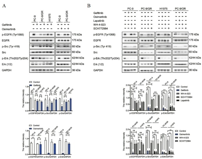 然后通过MTT测定法测量细胞活力。本研究使用了购自AbMole的Rapamycin(M1768),Y-27632(M1817)和SCH772984(M2084)三种产品,分别为mTOR,ROCK和Erk的抑制剂。为了确定EGFR信号激活后,哪种信号通路驱动ERRα重新表达,研究人员分别用Rapamycin、AG-490、BAY 11-7082、SIS3、Y-27632、SCH772984和WH-4-023等抑制剂检测了最常见的异常激活通路,包括mTOR、STAT3、NF-κB、Smad、ROCK、Erk和Src。最终发现Src和Erk激酶抑制剂能持续抑制NSCLC细胞中ERRα蛋白和mRNA的表达(图4A-B)。进一步分析表明,在耐药细胞中,EGFR、Src和Erk信号传导对Gefitinib或Osimertinib的抑制作用不敏感(图8A)。