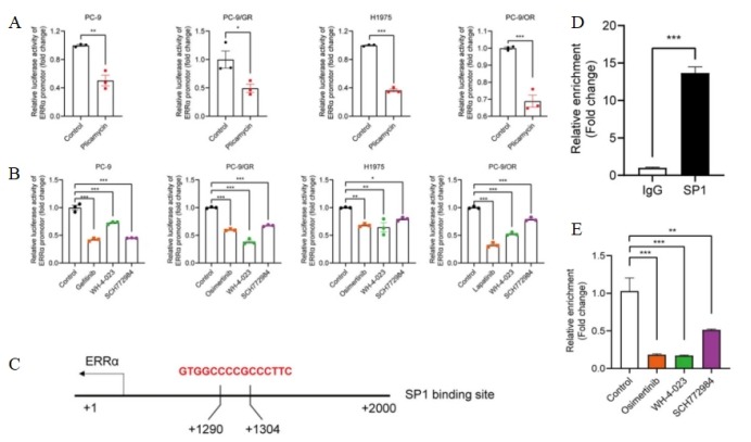 图9 A-B 进行荧光素酶测定以确定ERRα启动子活性。C. SP1的结合位点在启动子区域1304-1290 bp。D.CHIP-qPCR分析显示,H1975细胞中SP1结合位点的启动子扩增片段在抗SP1抗体和抗IgG抗体的作用下沉淀。E. H1975细胞经Osimertinib、SCH772984、WH-4-023处理48小时后进行CHIP-qPCR分析。