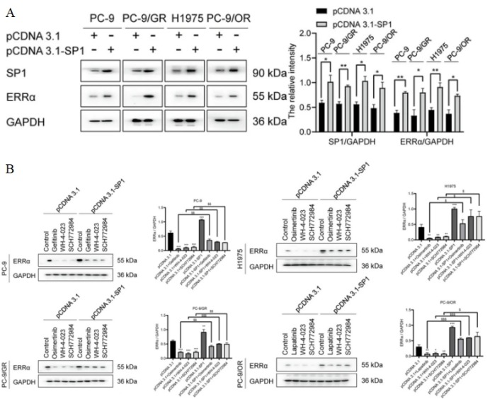图6 A. 用空pCDNA3.1或pCDNA3.1-SP1转染细胞48 h,Western blot检测SP1和ERRα的蛋白水平。B. 用空pCDNA3.1或pCDNA3.1-SP1以及EGFR、Erk、Src抑制剂转染细胞48 h。