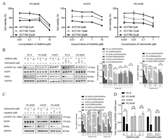 图3 A. 用Gefitinib, Osimertinib单独或与XCT790联合处理细胞48小时,然后进行MTT检测。B. Western印迹显示给药Gefitinib或Osimertinib后p-EGFR、EGFR和ERRα蛋白的水平。C. Western印迹显示用Osimertinib或Lapatinib处理后的蛋白质水平。D. 将PC-9、PC-9/GR、H1975和PC-9/OR细胞用1 μM Gefitinib或0.1 μM Osimertinib处理6 h,RT-qPCR显示ERRα的mRNA水平。