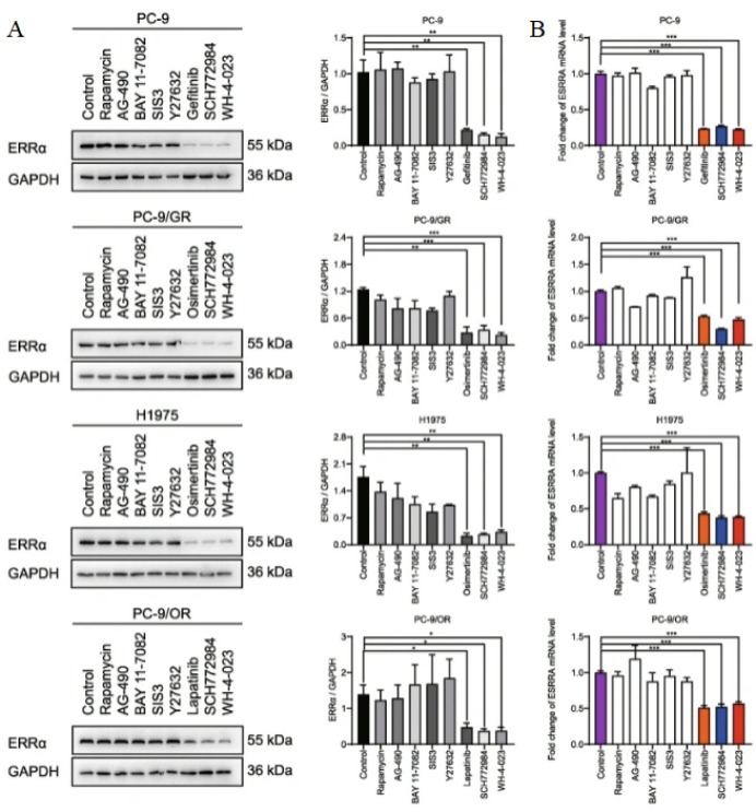 图8 A. 用1 μM Gefitinib或0.1 μM Osimertinib处理细胞48 h,Western blot检测蛋白水平。B. 用Gefitinib、Osimertinib、Lapatinib、WH-4-023或SCH772984处理细胞48 h,Western blot检测蛋白水平。荧光素酶检测发现,ERRα启动子活性被Plicamycin、Gefitinib、Osimertinib、Lapatinib、WH-4-023和SCH772984下调(图9A-B)。
