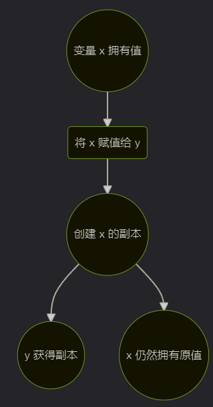 }与移动语义不同,复制语义是指当一个值被赋值给另一个变量或作为参数传递时,会创建该值的一个副本,原变量和新变量都拥有各自独立的副本。在 Rust 中,只有实现了 Copy 特征的类型才能使用复制语义。例如: