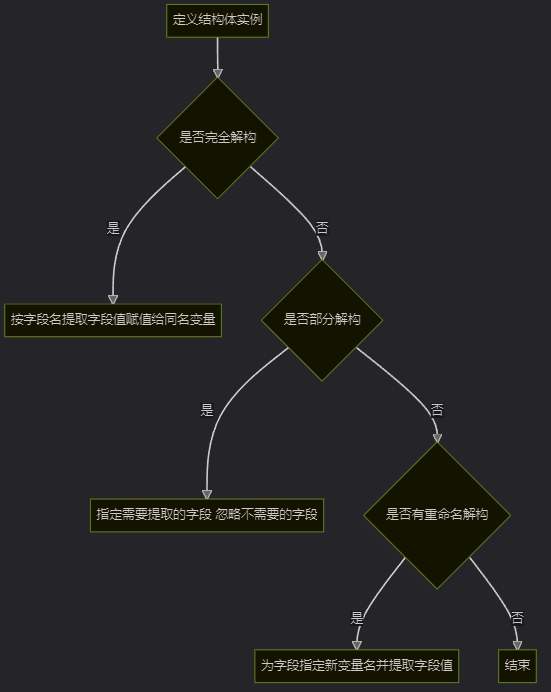 解构结构体的方式与解构元组类似,但需要使用结构体的字段名。以下是几种常见的解构方式: