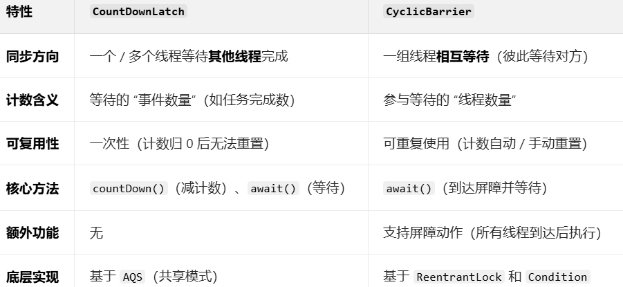 CyclicBarrier:让一组线程相互等待,直到所有线程都到达某个共同的屏障点(Barrier) 后,再一起继续执行。核心是 “线程间相互等待”,是一种 “双向同步” 机制(屏障可重复使用)。