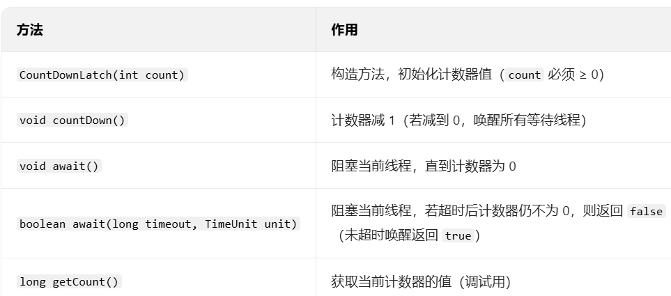 countDown() 方法将计数器减 1。await() 方法阻塞,直到计数器减为 0 时被唤醒,继续执行。特点:计数器一旦归 0,无法重置(一次性使用)。