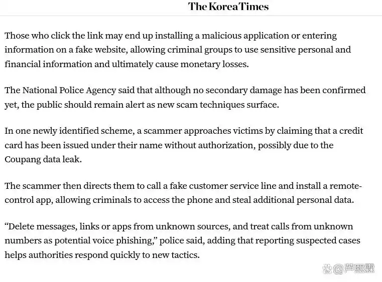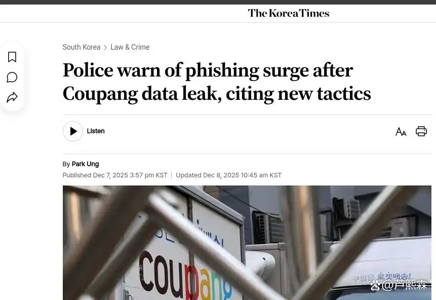 2025年12月初,韩国警方发布紧急预警,指出在电商企业Coupang发生大规模用户数据泄露后,全国范围内语音钓鱼(vishing)与短信钓鱼(smishing)案件显著上升。此次泄露事件自2025年6月起持续数月,直至11月被公开披露,涉及约3370万用户的姓名、手机号、收货地址及部分订单记录等敏感信息。犯罪团伙利用这些高可信度的原始数据,结合社会工程学手段,设计出高度定制化的诈骗话术与交互流程,使得传统基于规则或关键词过滤的反钓鱼机制面临失效风险。