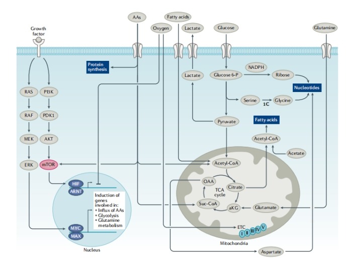图1 糖代谢、脂质代谢、氨基酸代谢的重要靶点[1]
