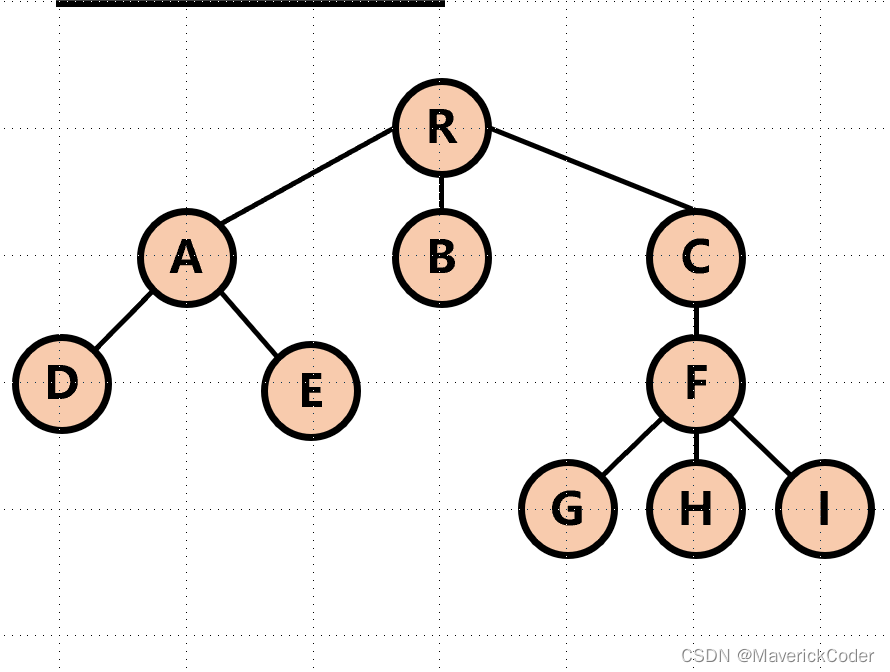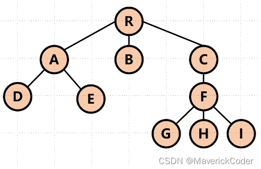 如果根据度数分类的话,可分为三类根结点root(该图中R)、叶子结点leafNode(无子结点的结点D、E、I)、普通结点(A、B、C、F)。