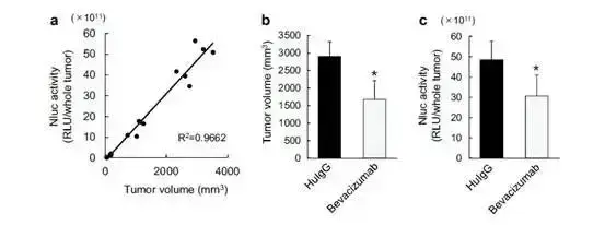 结果表明,接受Bevacizumab治疗的小鼠肿瘤平均体积以及平均Nluc活性均显著低于对照组。