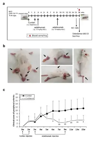 Adalimumab是靶向TNF-alpha的人源化单克隆抗体,抑制TNF-alpha,适用于人源及非人源化小鼠。首先将有BALB/c背景的SKG小鼠进行分组,一部分腹腔内注射经PBS稀释的Curdlan ,另一部分仅注射PBS。然后再将一半数量的注射了Curdlan的小鼠给与Adalimumab的治疗。