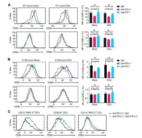 Atezolizumab是人源、IgG1单克隆抗体,阻止PD-L1与PD-1和B7.1的相互作用,但不影响PD-L2与PD-1的相互作用,适用于人源及非人源化小鼠。首先将CT26细胞经皮下注射入BALB/C小鼠体内,待肿瘤长至适当体积,再将Atezolizumab或对照IgG经腹膜注射入小鼠。之后收集肿瘤,并检测其中活细胞上CD80或CD86的表面表达。
