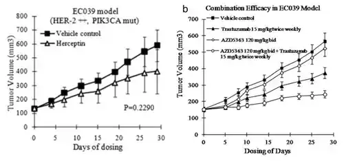结果表明,PIK3CA基因突变且HER2表达阳性的PDECX小鼠对Trastuzumab或AZD5363的单独治疗不敏感,但Trastuzumab与AZD5363的联合治疗能明显地抑制该肿瘤的生长。