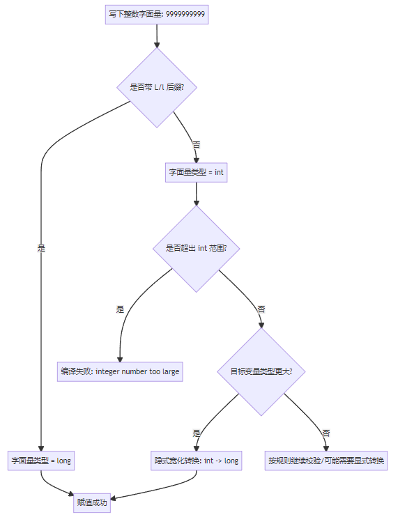 intint -> long 是宽化转换,允许隐式发生int 范围,必须显式声明为 long(加 L),否则直接编译失败