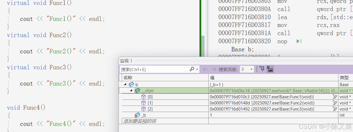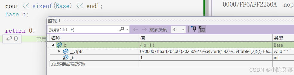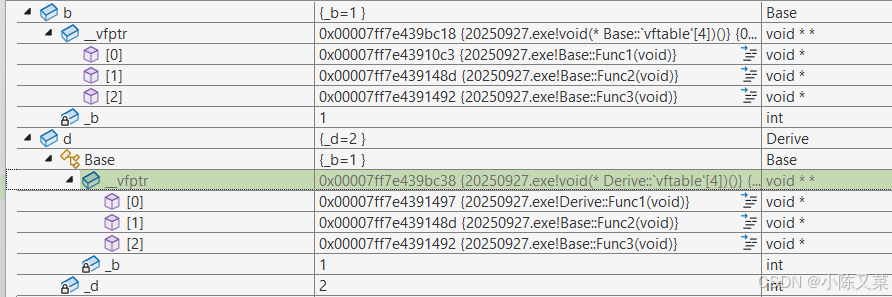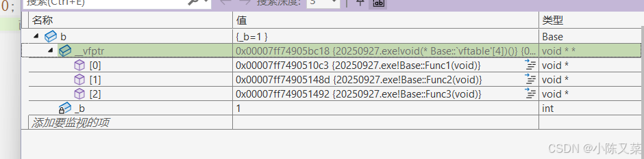 通过调试我们发现对象b中不仅有_b,还多了一个_vfptr,对象中的这个指针我们叫做虚函数表指针(v代表virtual,f代表function),一个含有虚函数的类中都至少有一个虚函数表指针,因为虚函数的地址要被放到虚函数表中,虚函数表也简称虚表。