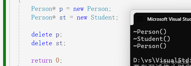 注意:只有派生类的析构函数重写了基类的析构函数,下面的delete调用析构函数才能构成多态,换句话说,就是基类析构函数一定要使用virtual关键字。