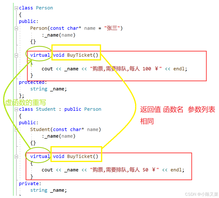 };注意:子类的虚函数就算没有添加virtual也同样构成重写(基类的虚函数在子类继承之后依然保持虚函数属性),但是这种写法并不规范。