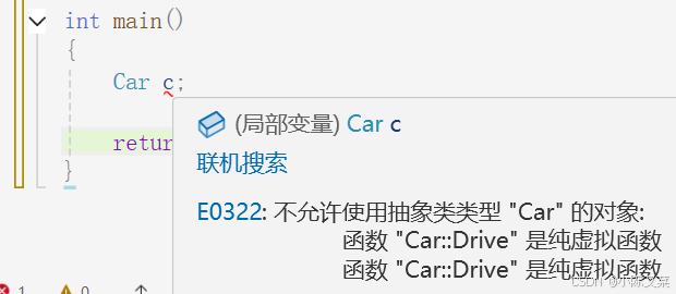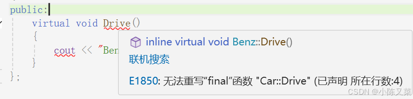};加入我们一旦去掉基类的virtual,override就会提示不能进行重写:
