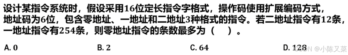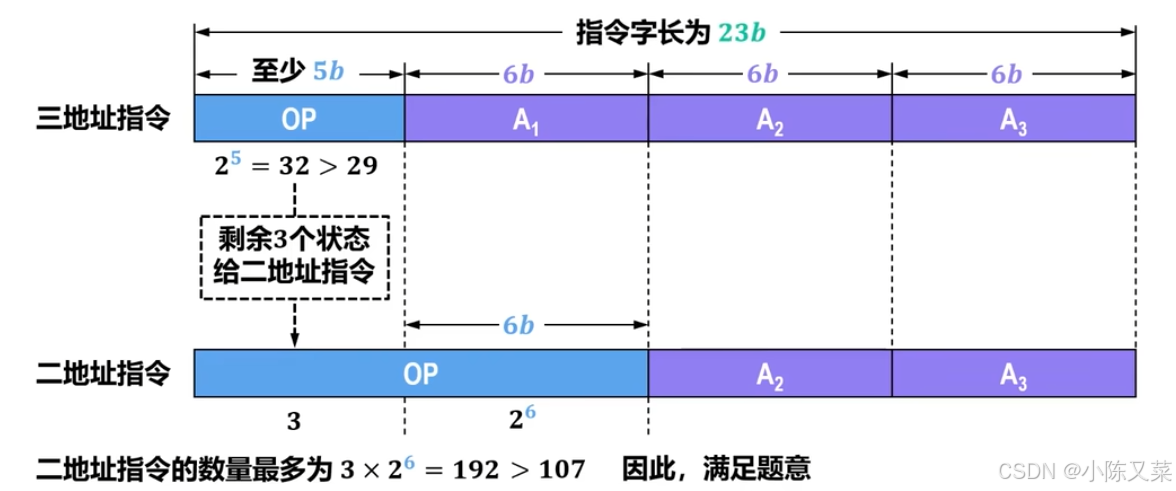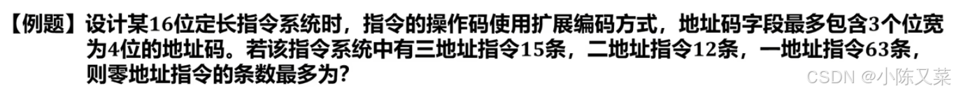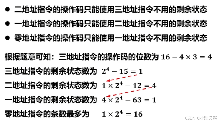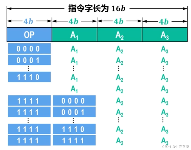也就是我减少一个地址码,这样就成为了二地址指令,那么这里要注意的是,短操作码不能是长操作码的前缀,所以如果我们将高四位取位1111,那么就要从16个三地址指令中操作码位1111的删除,从而增加了16个二地址指令,那么此时就总共会有15+16=31条指令。