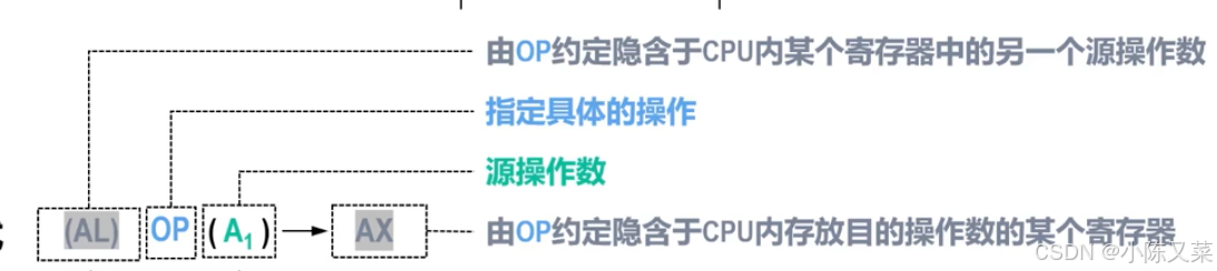 这里举例的AL寄存器中实际上隐含了一个操作数,所以实际上这个一地址指令,实现的是一个双目运算。这种情况下,隐含操作数双目运算,进一步缩短了双目指令类的指令字长。
