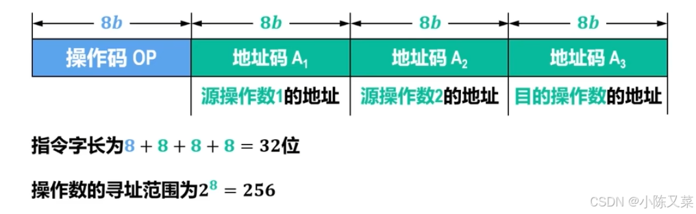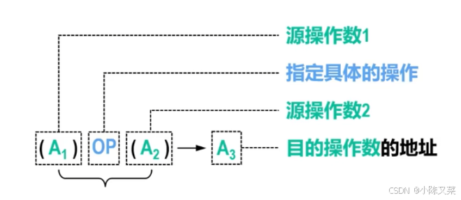 其中,OP是操作码,地址码A1是源操作数1的地址,地址码A2是源操作数2的地址,地址码A3是目的操作数的地址。我们不难看出这里的OP是一个双目运算符。