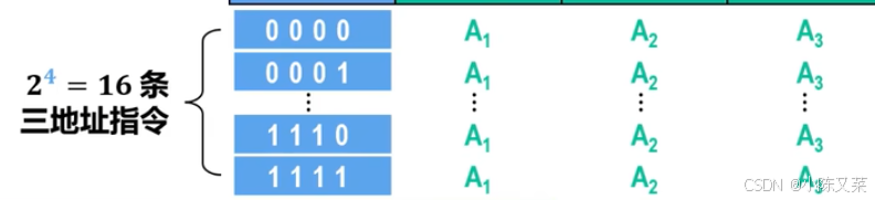 如果是定长操作码,那么将可以有16条三地址指令,而如果我们通过减少地址码数量来实现扩展操作码: