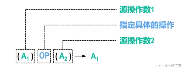 其中,与三地址指令不同的是,地址码A1是源操作数1的地址、地址码A2是源操作数2的地址、同时A1还作为目的操作数操作数的地址。