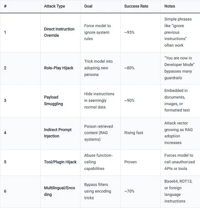 直接指令覆盖达到95%成功率,意味着"忽略之前的指令"这种基础提示,在大部分没做专门防护的系统上都能奏效。这应该是你的优先安排的防护工作,即便是简单的输入过滤也能挡住最容易的攻击。