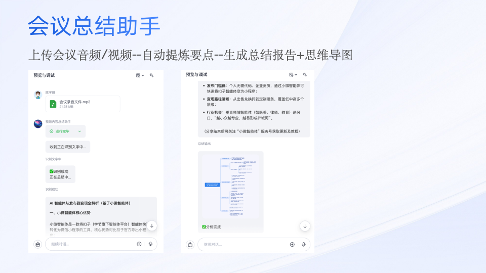 一键生成:上传音视频,自动产出会议总结与思维导图。